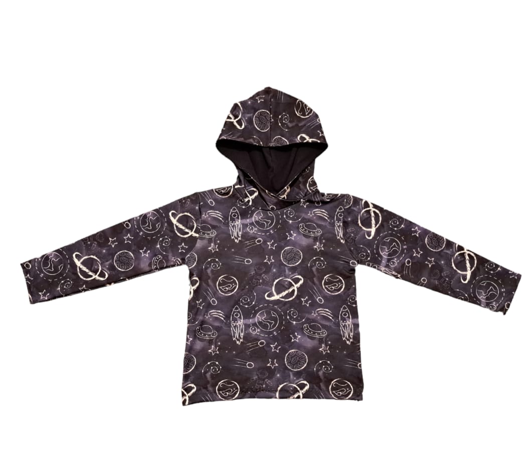 There are a couple of fun options for the hoodies. You may choose to have all one fabric or I can use two fabrics and have a diagonal stripe of contrasting fabric going from one sleeve, across the body and onto the other sleeve. (This can be seen in the photos) The other option is to have the main body and sleeves one fabric and choose a plain colour for the cuffs, waistline and hood lining. It is entirely your choice! Just let me know in comments when ordering.