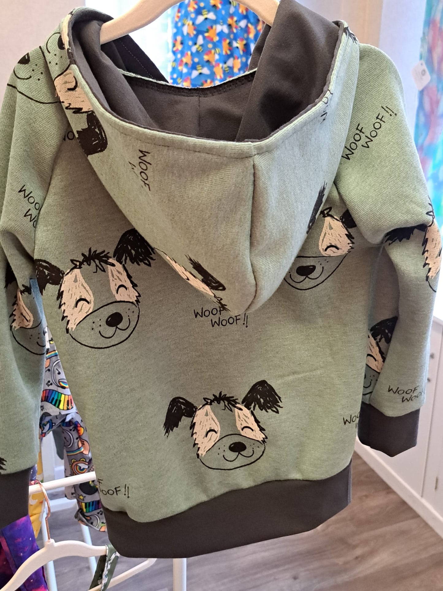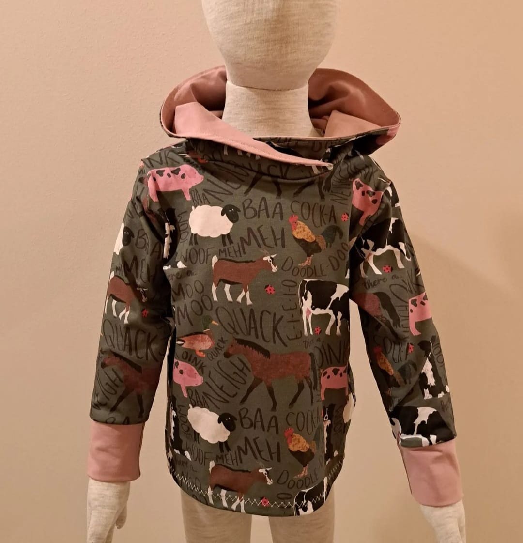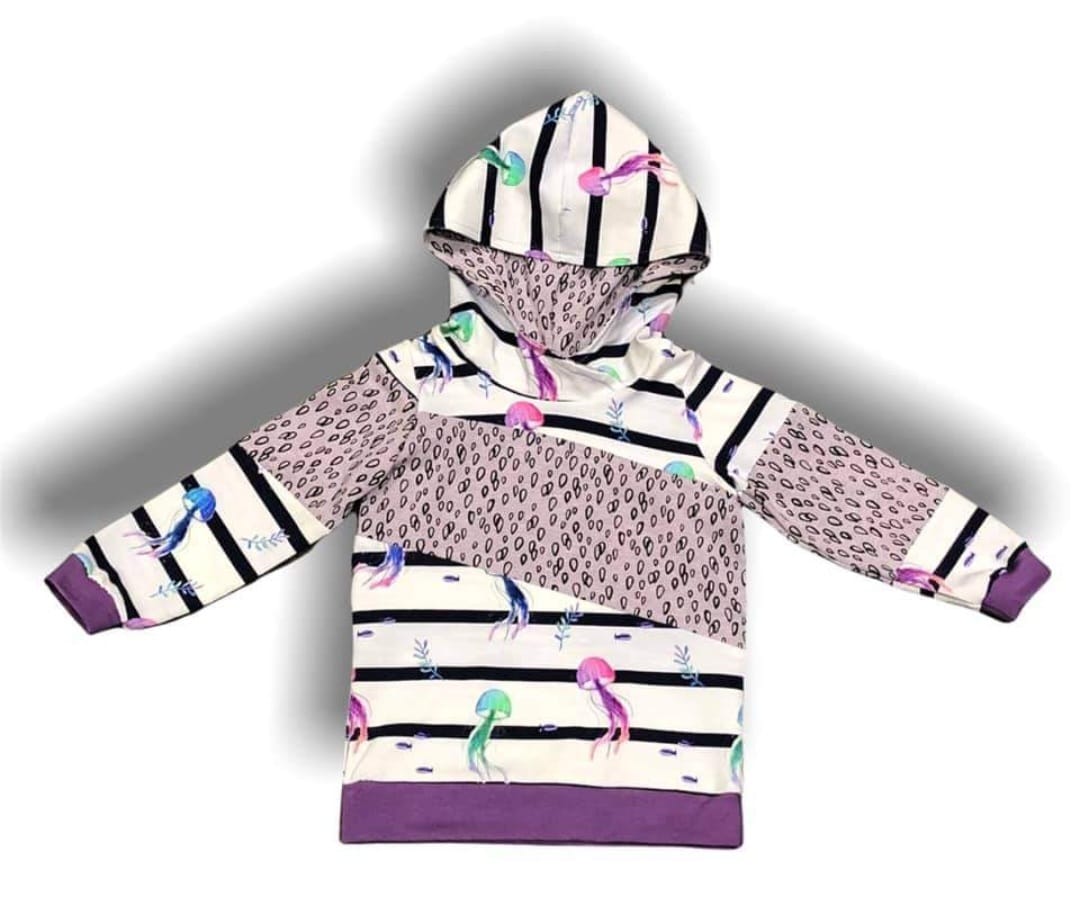 There are a couple of fun options for the hoodies. You may choose to have all one fabric or I can use two fabrics and have a diagonal stripe of contrasting fabric going from one sleeve, across the body and onto the other sleeve. (This can be seen in the photos) The other option is to have the main body and sleeves one fabric and choose a plain colour for the cuffs, waistline and hood lining. It is entirely your choice! Just let me know in comments when ordering.