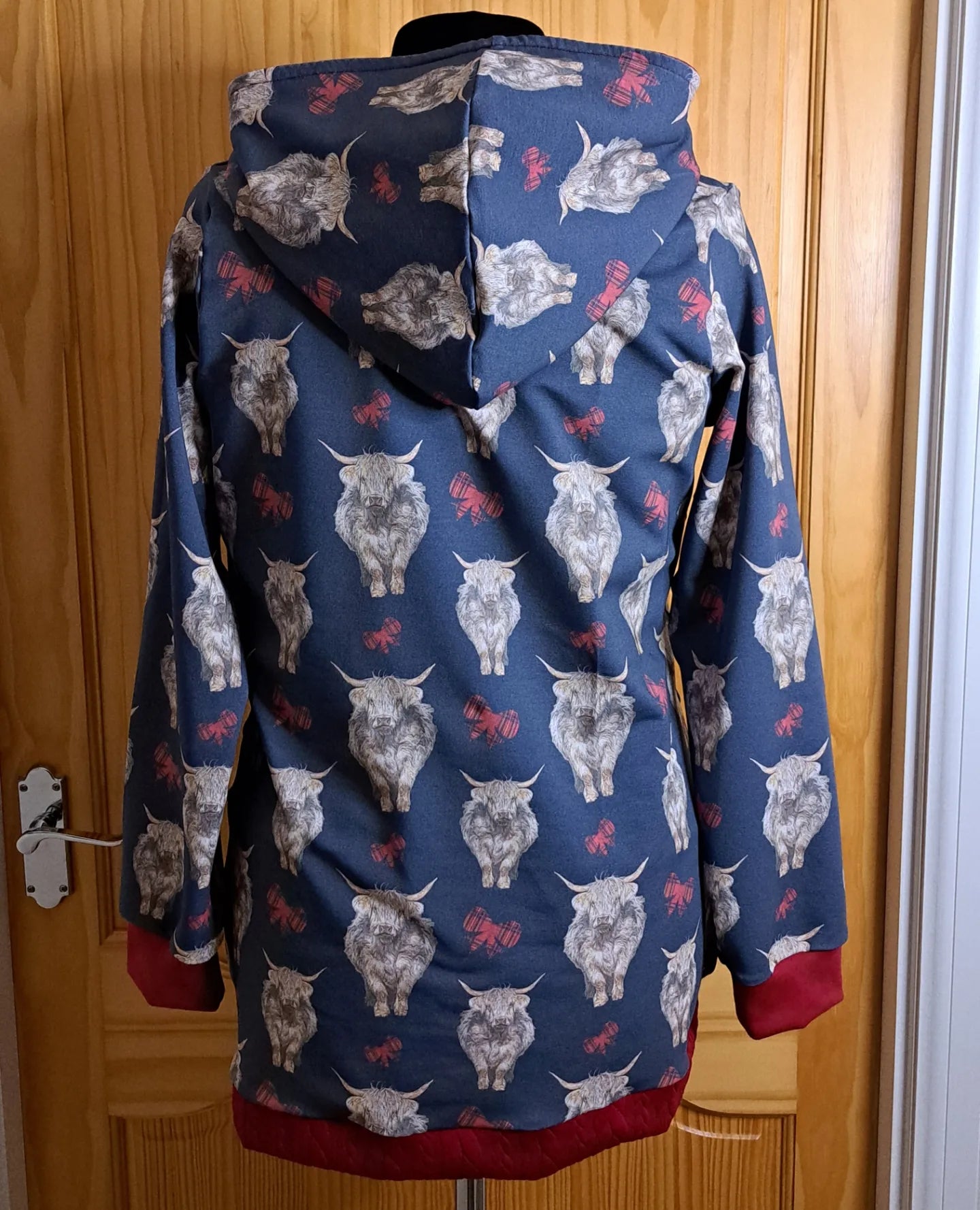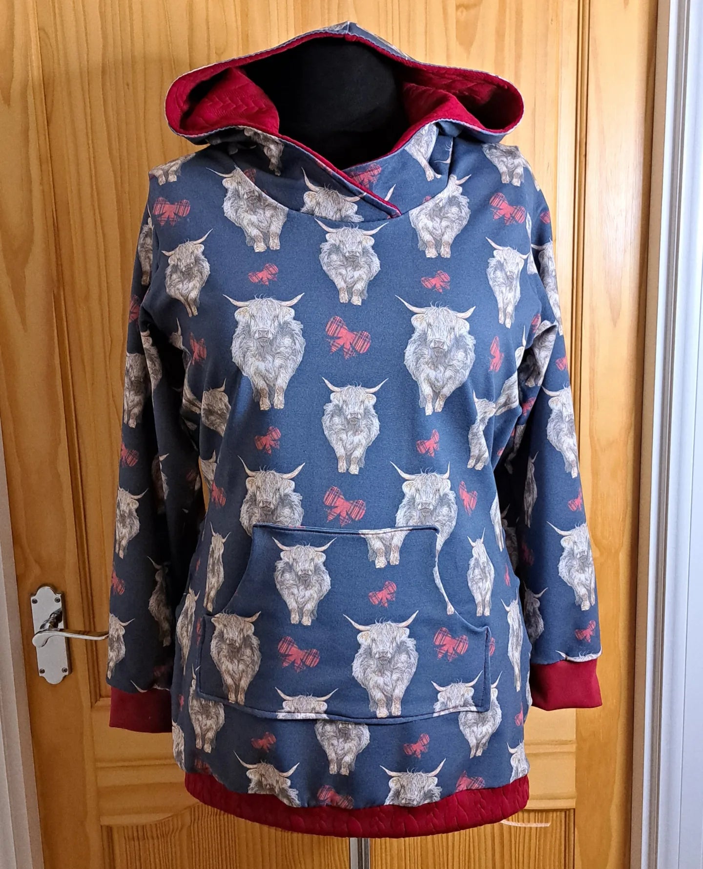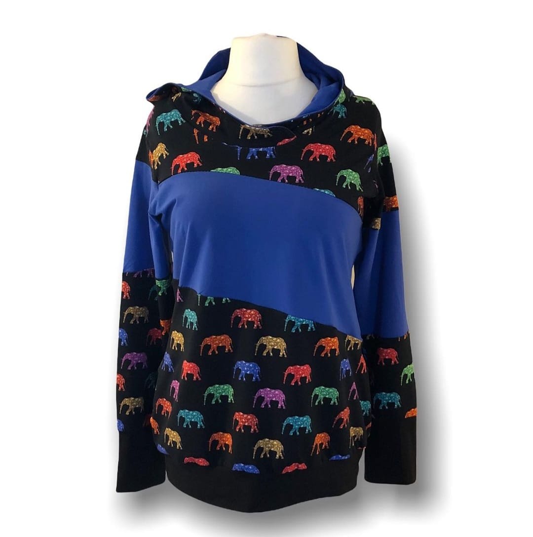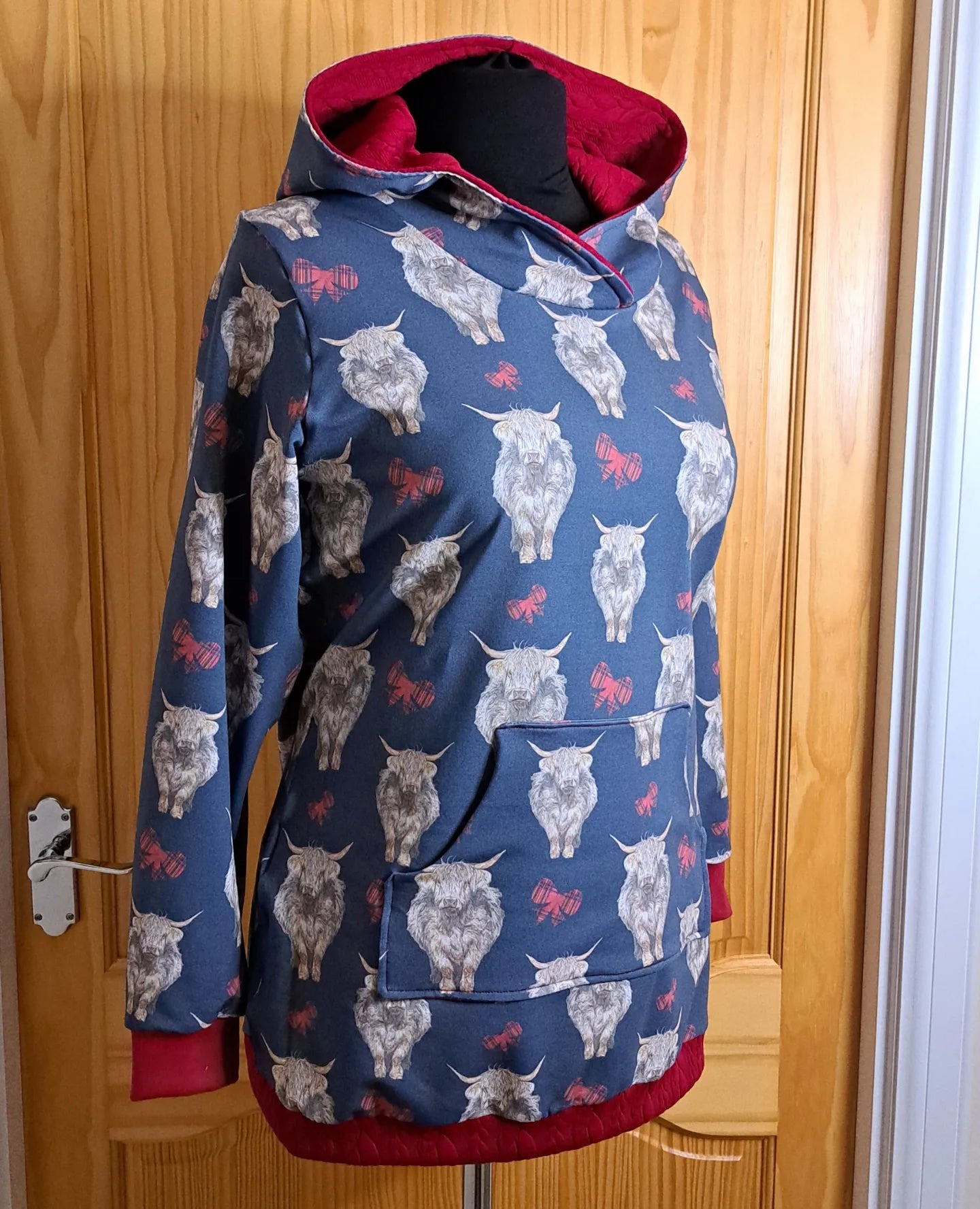 There are a couple of fun options for the hoodies. You may choose to have all one fabric or I can use two fabrics and have a diaganol stripe of contrasting fabric going from one sleeve, across the body and onto the other sleeve. (This can be seen in the photos) The other option is to have the main body and sleeves one fabric and choose a plain colour for the cuffs, waistline and hood lining. It is entirely your choice! Just let me know in comments when ordering.